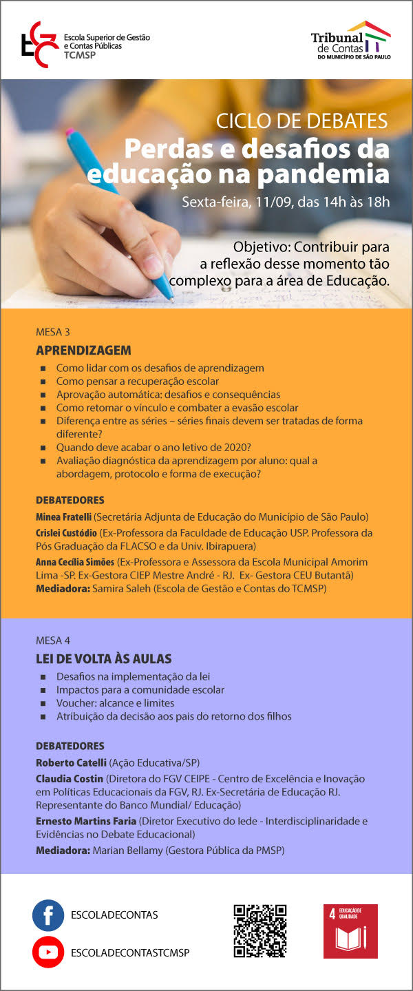 Para lançar luz sobre os desafios educacionais num contexto de pandemia e projetar cenários futuros da atuação docente e de políticas públicas dentro de uma realidade cada vez mais tecnológica, a Escola de Gestão e Contas (EGC) do Tribunal de Contas do Município de São Paulo promove o ciclo de debates “Perdas e desafios da Educação na pandemia”. Nos dias 11 e 18 de setembro, em ambiente virtual, gestores públicos e especialistas em Educação discutem os impactos da crise sanitária e alternativas possíveis para mitigar os danos nessa área profundamente afetada.