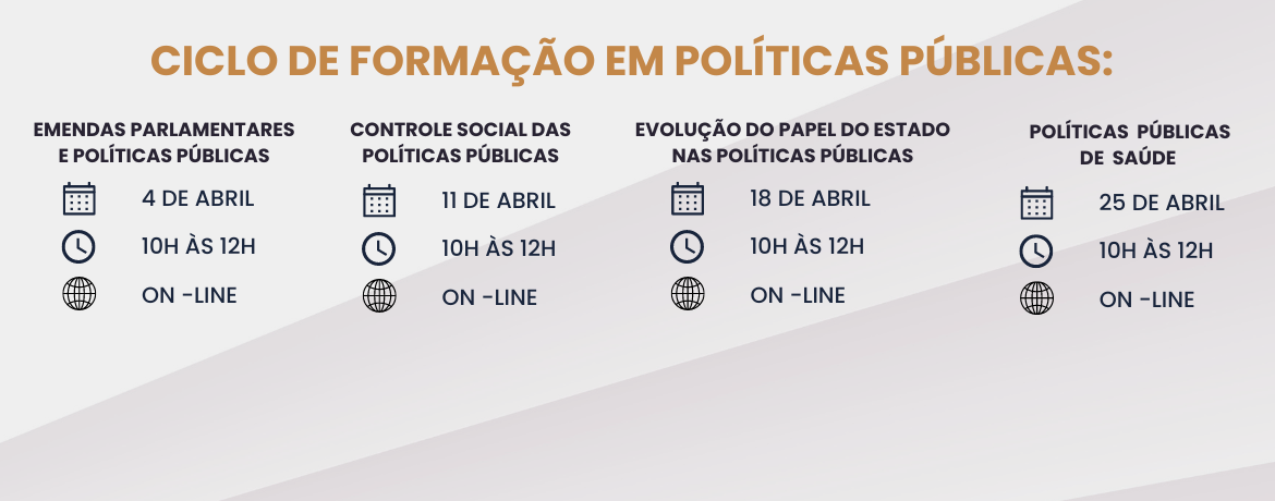 A sequência de formação desse ciclo aborda, no dia 11 de abril, das 10h às 12h, o “Controle Social das Políticas Públicas”. O curso tem por objetivo apresentar os elementos que permitem a ação do controle social, com destaque para os conselhos de políticas públicas. A formação terá apresentação da instrutora da EGC, Antônia Conceição dos Santos, doutora em Serviço Social.
